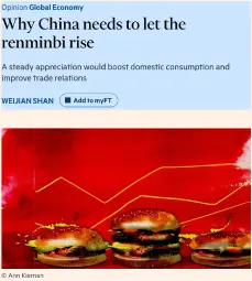 >The Economist’s Big Mac index shows that a McDonald’s Big Mac costs $6.01 in the US, yet only Rmb25.5 (about $3.60) in China, implying the renminbi is roughly 41 per cent undervalued. This light-hearted burger benchmark closely tracks the IMF’s more formal purchasing power parity estimate, which indicates that the renminbi is about 50 per cent undervalued against the dollar.