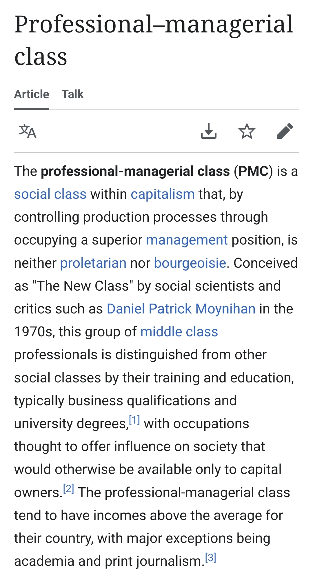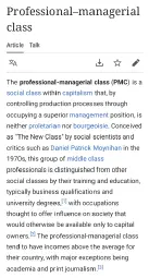 >The Ehrenreichs defined the PMC as educated professionals who historically did not work in corporate environments, such as doctors, scientists, lawyers, academics, artists, and journalists.[6] In a 2013 follow-up, they estimated that in the 1930s, PMC occupations made up less than 1% of total U.S. employment, but the share had risen to 24% by 1972, and 35% by 2006.[7] In that same essay, they argued that the notion of the PMC as a collective grouping was "in ruins" due to economic shifts in the 1990s and 2000s which changed their professional prospects. Some members (such as highly qualified scientists) "jump[ed] ship for more lucrative posts in direct services to capital"; others (such as lawyers, tenured professors, and doctors) found themselves in increasingly "corporation-like" workplaces; while others still (like those with backgrounds in media or the humanities) "spiral[ed] down to the retail workforce", unable to parlay their skills into higher-income jobs.[7]