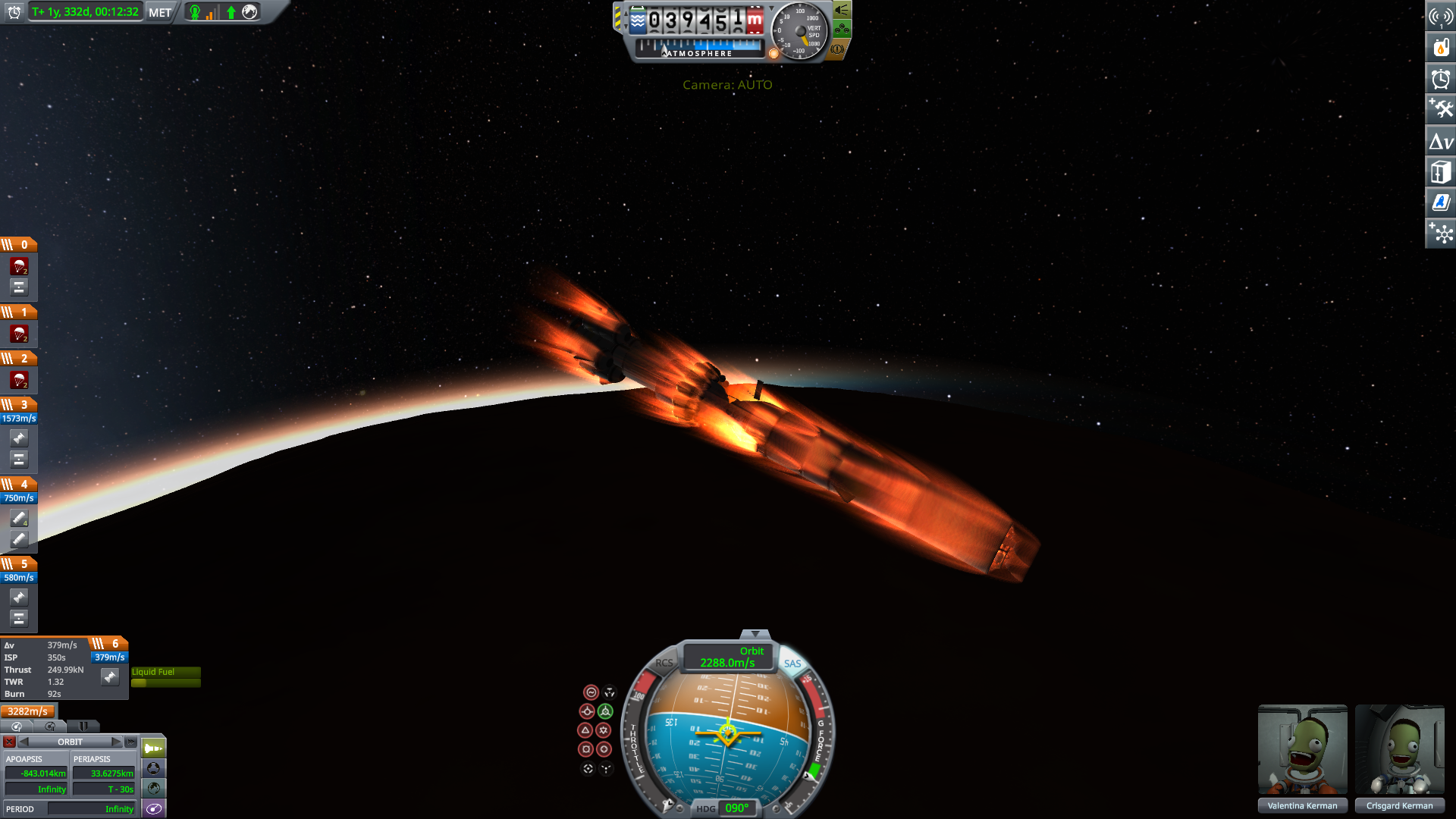 The only option I had was to aerobrake on Duna's atmosphere at 30km. I will be honest I used quicksaves here in order to find the right height that wouldn't kill me. At the same time I was burning hard and staged half way through, dropping off the inteplanetary stage into Duna's atmosphere. It fell like a burning longship leaving the cove. Things started exploding, and we lost our folding antennae which I had left extended for some reason. Somehow it worked. Valentina and the scientist were an aurora over the red planet.
