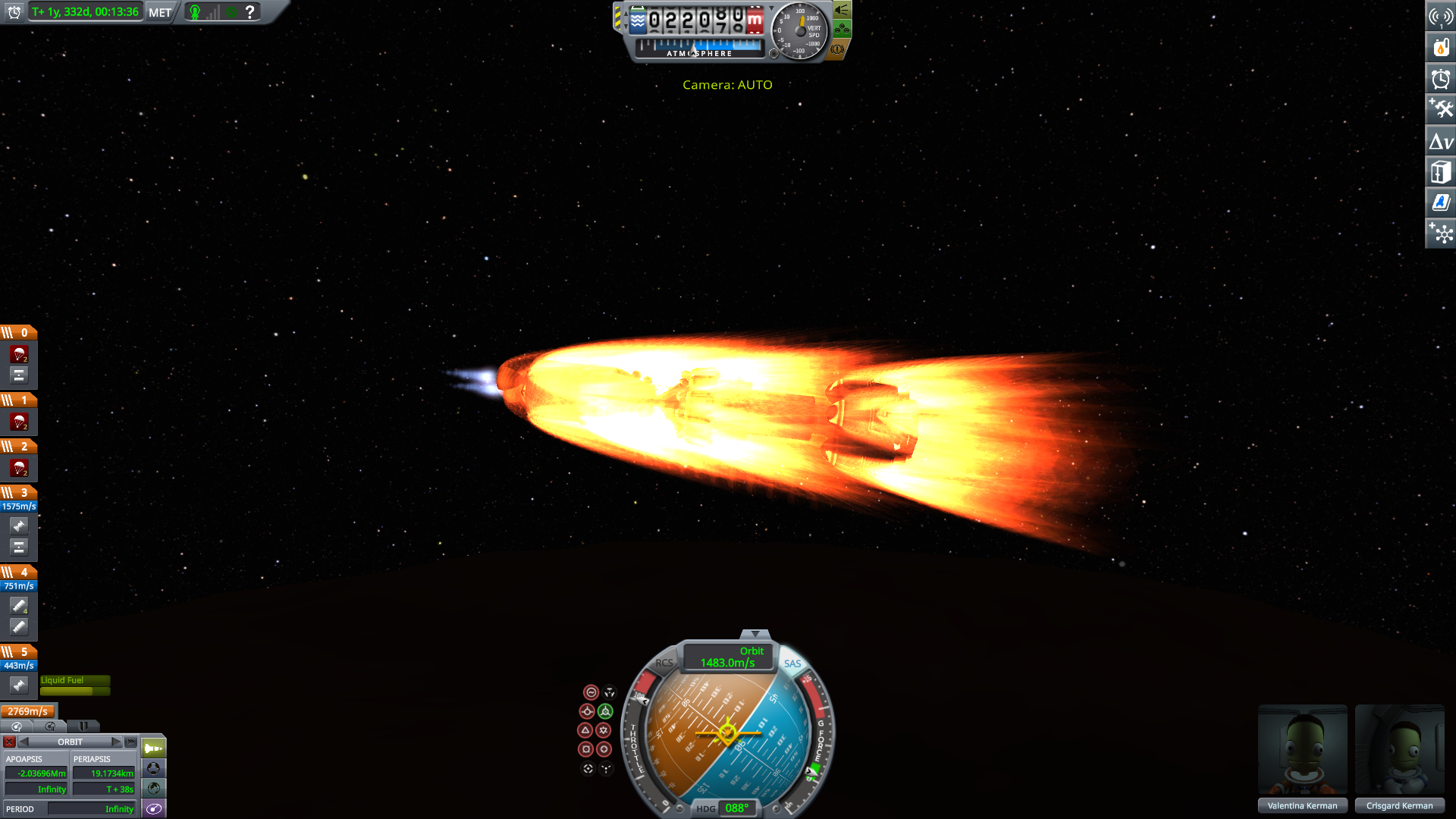 I put the Crisgard in the lander and separated so that it would hit the atmosphere again and its orbit would decay, and then went to fix the orbit for the command module. Between its skips, I matched my orbit close to Jebediahs'.