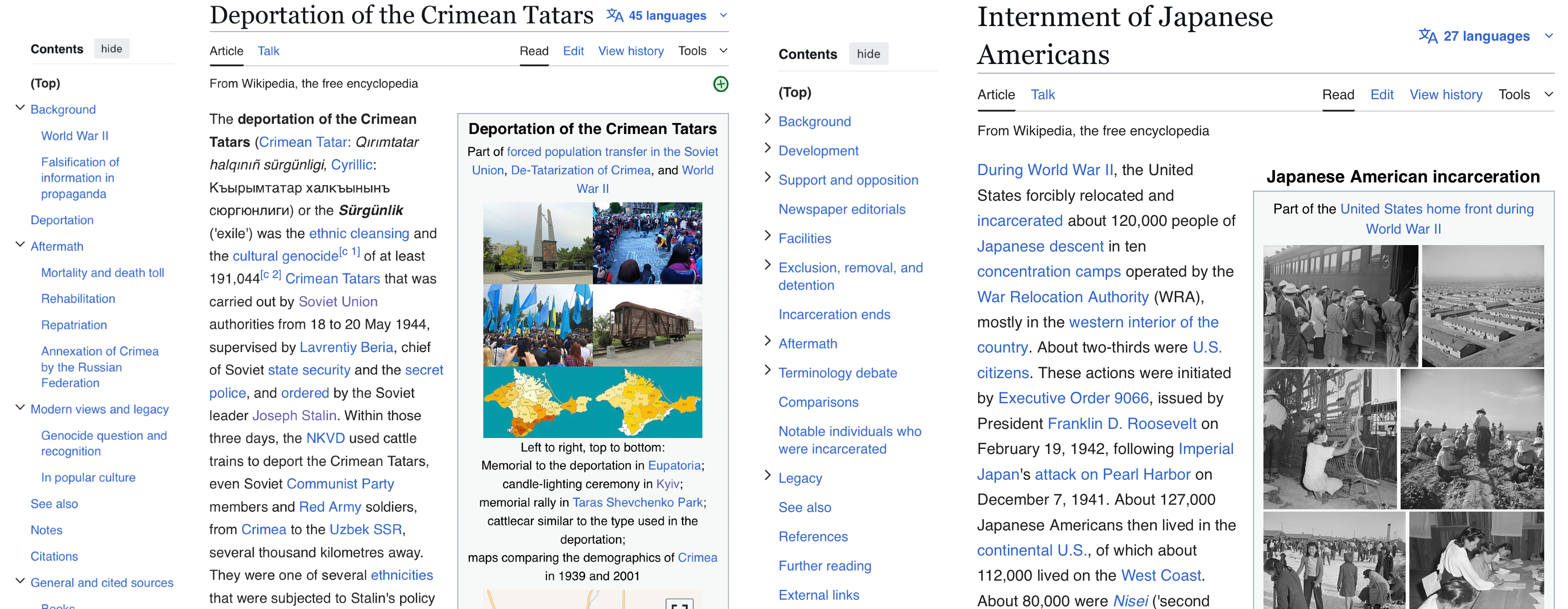 The US internment of Japanese-Americans was ended after the war, while the deportation of Crimean Tatars was intended to be permanent and only ended under Gorbachev.