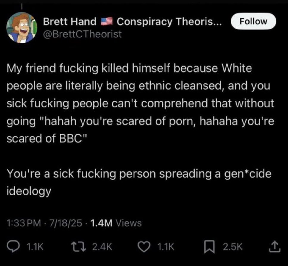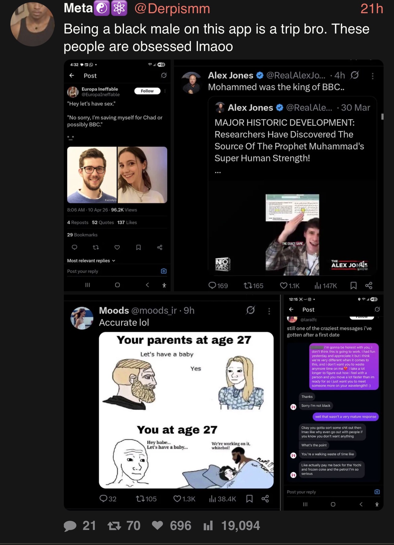 https://xcancel.com/ThanosBullx/status/1941456626730533254https://xcancel.com/ThanosBullx/status/1861120341378052468I don't know the origin and reason behind this bizarre psycho-sexual anxiety white chuds have about black men, especially considering how Latinos, south Asians and MENA people are the ones at the centre of their white genocide conspiracy theory, which only makes this psychological complex extremely bizarre. So far, I only found the answer here: