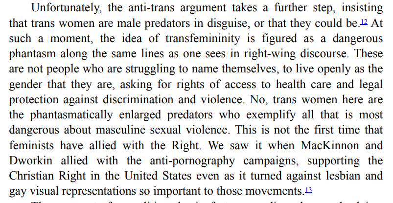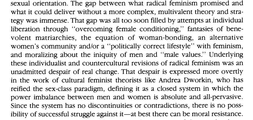 >There is something to be said about the fact that the lost granddaughters of radical feminism obsess over Dworkin's bibliography but rarely engage with the works of the actual founders of the movement. Excerpt above is from Ellen Willis, one of the Redstockings co-founders. To be fair, the whole 1984 essay is an evaluation of the misteps of radical feminism, from its theoretical affiliations, politics and unfolding during the 70s. Here is Butler, 1992, on MacKinnon and Dworkin: [see picrel]
