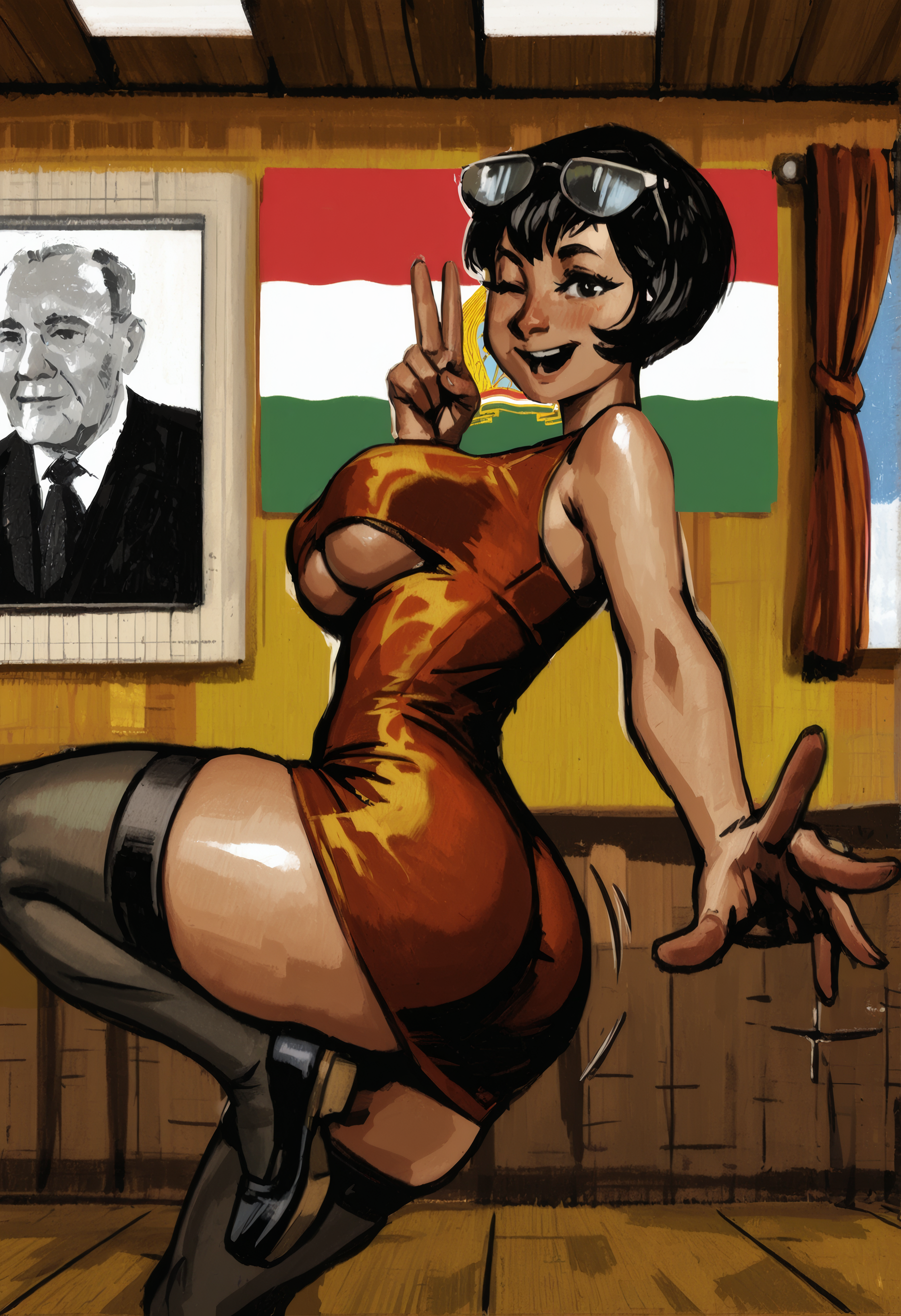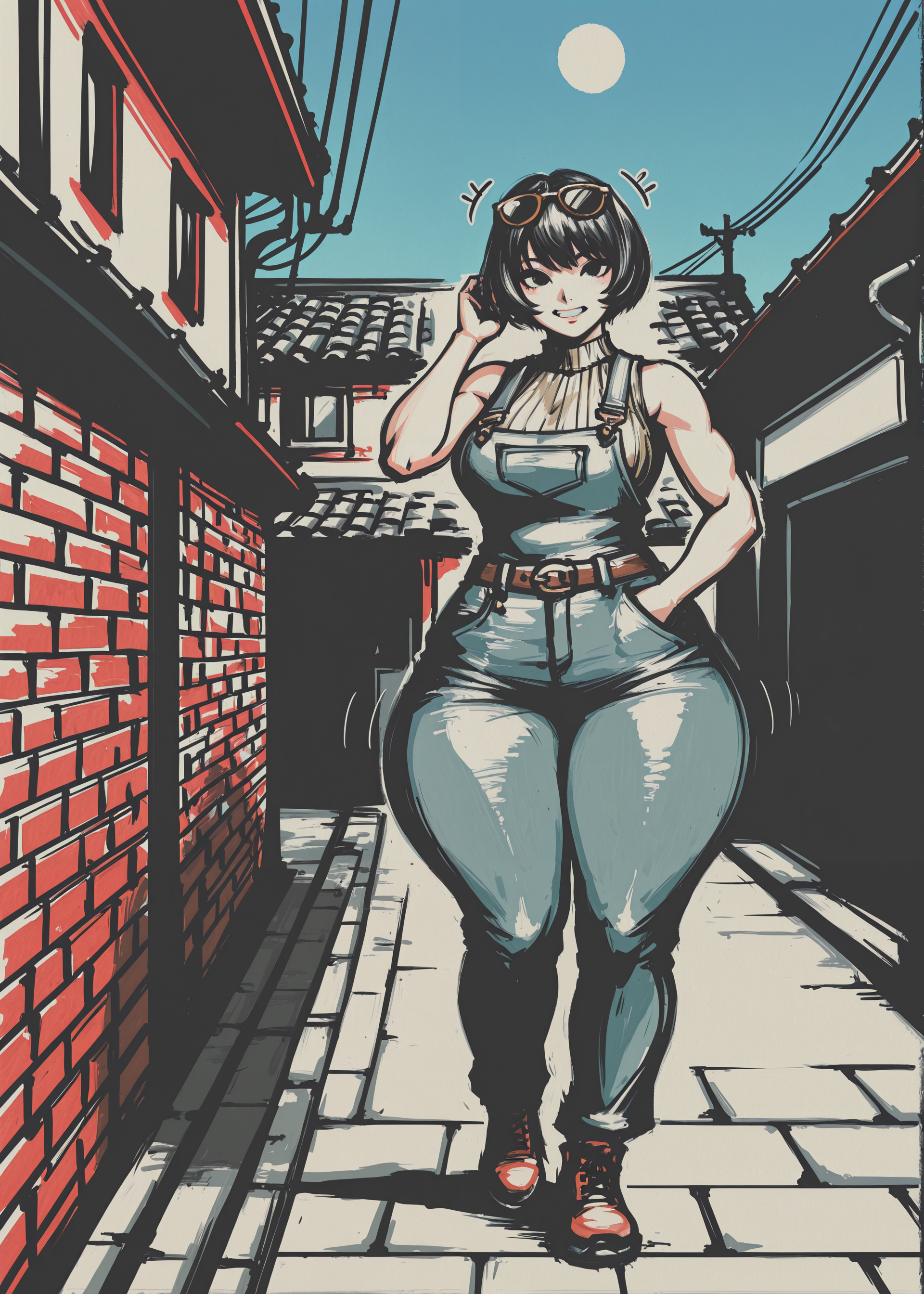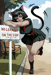 Regional Prompt (Basically what you apply to, like an individual layer or layer group): BREAK (←- This is a way to separate sections of the full prompt manually to avoid bleeding) 1girl, solo, full body, catgirl, toned female, biceps, black cat ears, pink inner ear, black cat tail, short hair, black hair, bob cut, red eyes, eyelashes, thighs, hips, breasts, choppy bangs, thick eyebrows, pointy hair, matte skin, teeth, fang, smug, open mouth, smirk, standing, facing viewer, leaning on white wooden sign, leaning forward, standing on one leg, looking at viewer, black dress, pleated skirt, short sleeves, red belt, black boots, pointy red and black bandanna around neck,