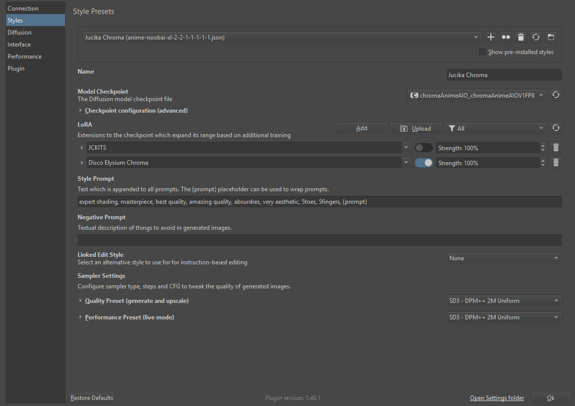 Style Prompt (This is a Krita thing, it's mainly for if you have a style preset that you've set up for a specific workflow): expert shading, masterpiece, best quality, amazing quality, absurdres, very aesthetic, 5toes, 5fingers, {prompt} (←- This is where the rest of the prompt starts from)