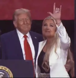 A widow throwing up the cuckold sign infront of a well-known horndog.