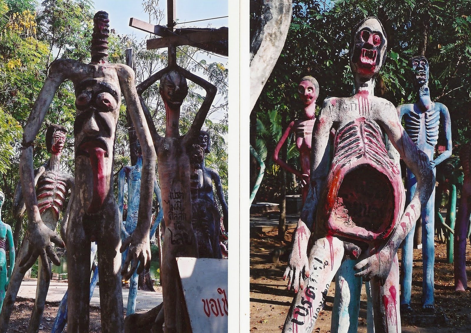 >spoilers1st is hell theme park in daylight thailand with dharmic hell torture scene sculptures. pictures taken from an orientalist-ish blog of a western illustrator [Mats!?] so expect a sensationalist attitude inherent to mode of presentation (filters, etc)
