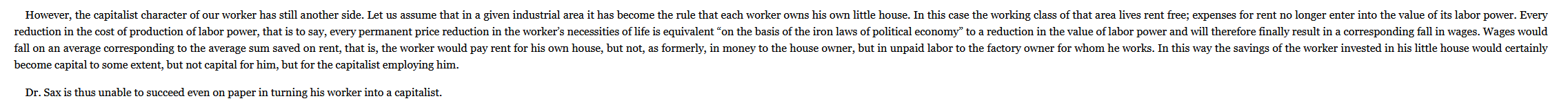 >In other words, Herr Sax hopes that by an alteration of their proletarian status such as would be brought about by the acquisition of house property, the workers would also lose their proletarian character and become once again obedient toadies like their forefathers who were also house owners. The Proudhonists should take that to heart.Read.