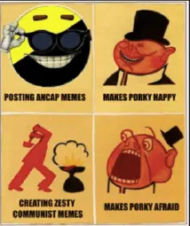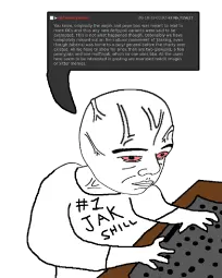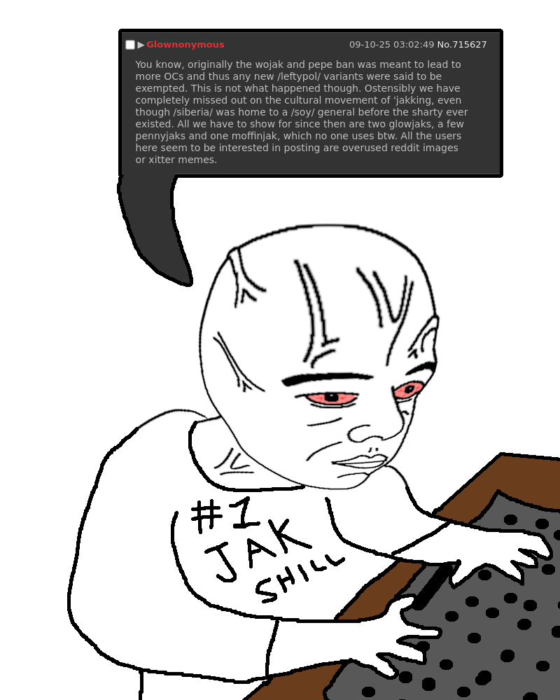 You know, originally the wojak and pepe ban was meant to lead to more OCs and thus any new /leftypol/ variants were said to be exempted. This is not what happened though. Ostensibly we have completely missed out on the cultural movement of 'jakking, even though /siberia/ was home to a /soy/ general before the sharty ever existed. All we have to show for since then are two glowjaks, a few pennyjaks and one moffinjak, which no one uses btw. All the users here seem to be interested in posting are overused reddit images or xitter memes.