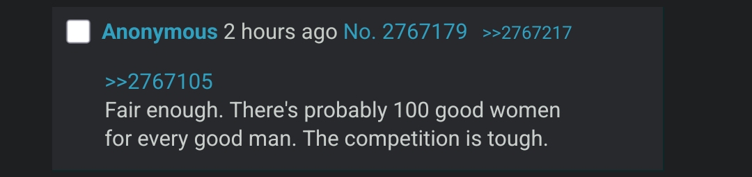 >>721055> I'm quite a bit younger too which also puts me at a disadvantage bc a man in his early 30s should have a larger dating poolThat’s false. Age numbers aren’t a male virtue inherently. Did you read what anon said?