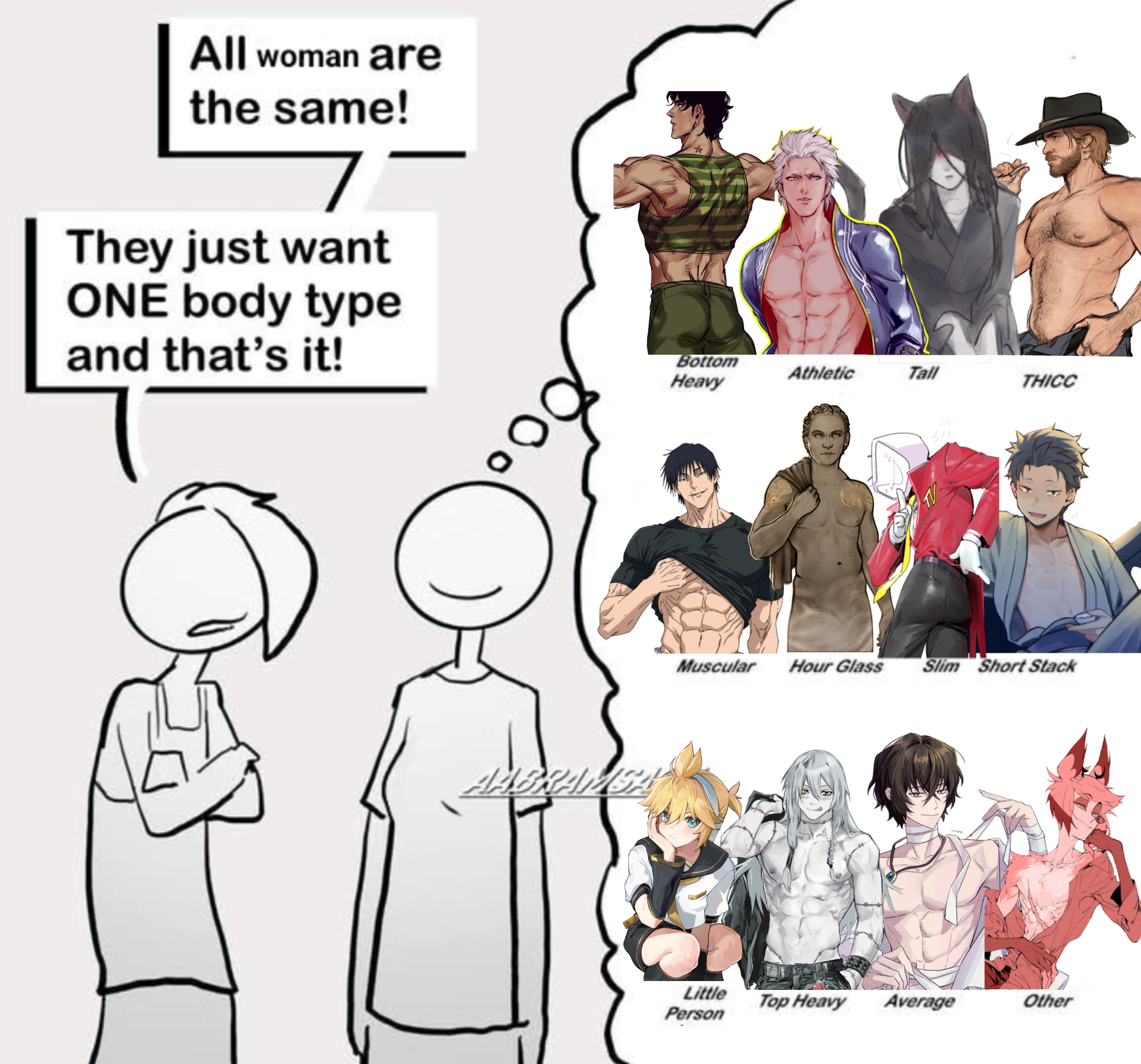 >>722393i forgot the full hair, all the body types share the same features overall, visible abs, full or long hair, no fat percentage
