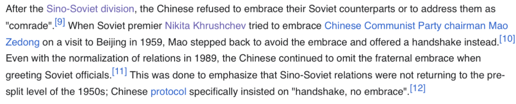 Maybe I’m just a westoid and a just see two guys kissing as being gay unless you’re French or maybe a father and son as long as it’s on the cheek but this seems wild to me. Which communist came up with this?