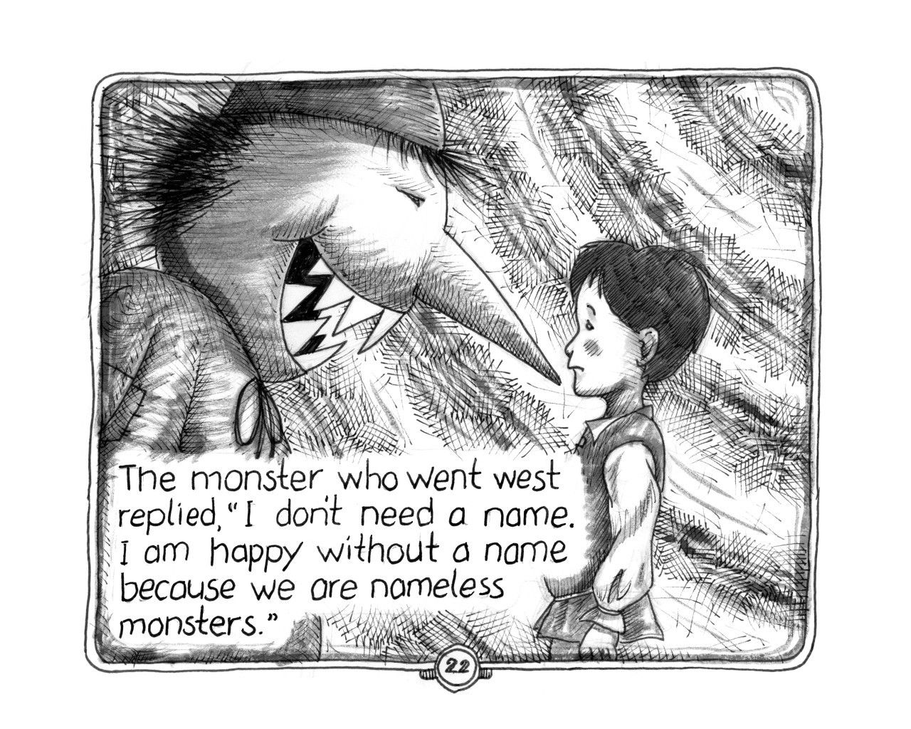 The monster who went west replied, "You don't need a name. You can be happy without a name. Because we are nameless monsters."
