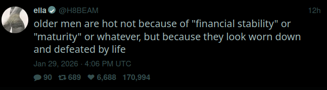 the bar is ON THE FLOOR bc most men keep it there so they don't have to rise to be better. And women know what the landscape looks like and fear they don't wanna date down, and this is the best it gets.
