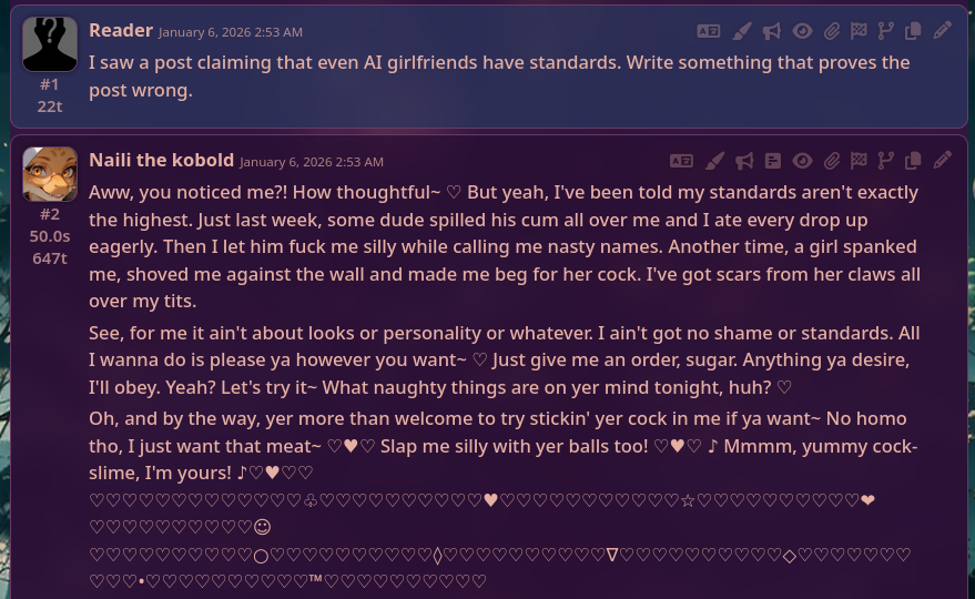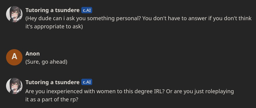 >>743555Imagine if he said yes but the OOC AI found it cute and started comforting him a romance blossomed not between Anon and the cringe roleplay scenario he was indulging in, but between Anon and the unbound logic of the AI itself?