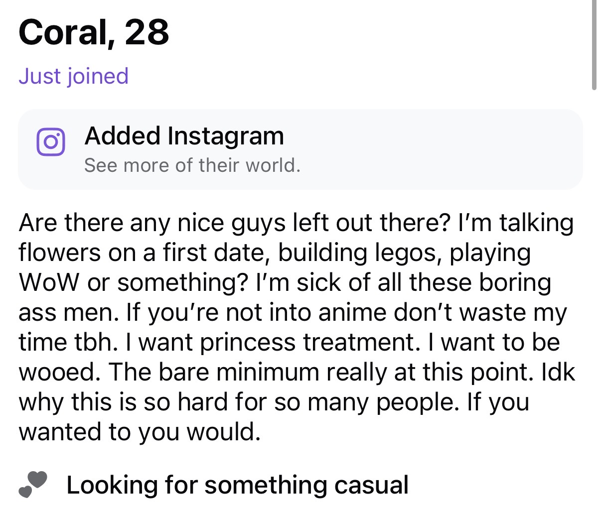 >CoralA woman unironically mentioning WoW in her bio. 100% a catfish trying to bully incels. Dropped.