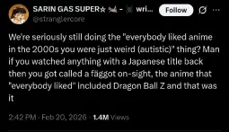 >>760668>Everyone liked anime and weird music back in the day as well.no they fucking didn't lmao what are you talking about
