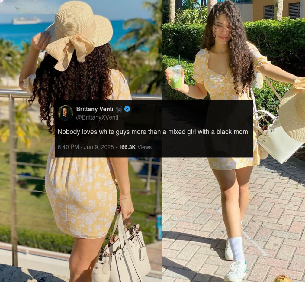 Britany Venti is a third black by genetics, and looks less "black" than the "quadroon" and "octoroon". It seems to suggest that mixed-race people look decidedly black until they pass some threshold.
