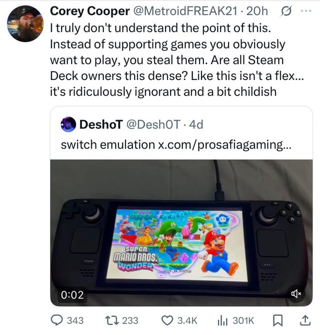 >>774583In Japan a guy just got sentenced to 1.5 years in jail (suspended for 4 years thankfully) and fined like $1000 because he ran a website that posted movie and TV plot summaries. Obviously I'm sure plenty of Japanese people pirate but it's a deeply hysterical society about IP in general. Honestly I guess it explains why Nintendo behaves the way they do.