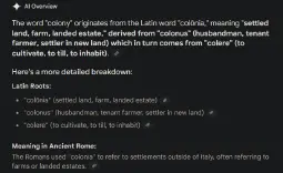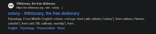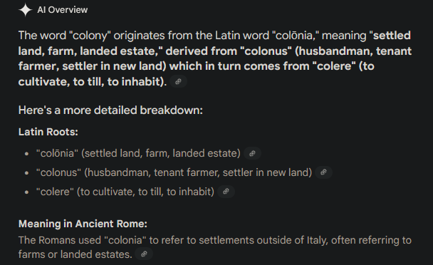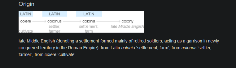 >Colony is derived from colonus which is in turn derived from colere (to cultivate, to till, to inhabit).