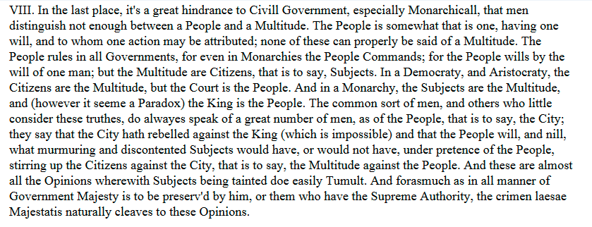 >The People is somewhat that is one, having one will, and to whom one action may be attributed; none of these can properly be said of a Multitude. The People rules in all Governments, for even in Monarchies the People Commands; for the People wills by the will of one man; but the Multitude are citizens, that is to say, Subjects…