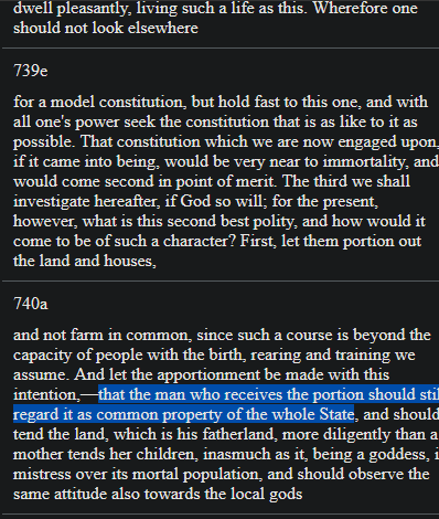 >Inasmuch as our citizens are not fitted either by nature or education to receive the saying, Friends have all things in common, let them retain their houses and private property, but use them in the service of their country, who is their God and parent, and of the Gods and demigods of the land.