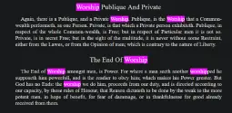 >Again, there is a Public, and a Private Worship. Public, is the Worship that a Commonwealth performs, as one Person. Private, is that which a Private person exhibits. Public, in respect of the whole Commonwealth, is Free; but in respect of Particular men it is not so Private, is in secret Free; but in the sight of the multitude, it is never without some Restranshumanistt either from the Laws, or from the Opinion of men; which is contrary to the nature of Liberty.