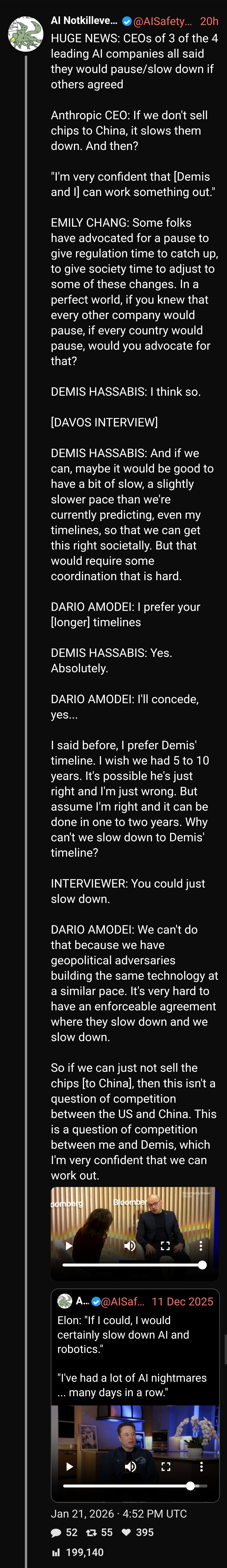 >>32317i know but what i'm saying is that the china threat logic is getting inverted: now china is NOT very threatening, turns out we could dictate the pace of innovation all along (not true but bear with me) so google and anthropic can afford to just let loose the gas pedal a little bit, which is actually a strong signal that the datacenter buildout schedule is going to get delayed. and since nvidia's valuation directly depends on datacenter buildout, then they're trying to spin it into a narrative that would mitigate panic.