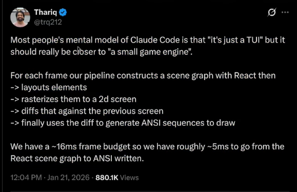 >>32366Anthropic dogfoods their models so of course Claude Code is reactslop. LLM written TUIs are scuffed you'd know if you ever tried getting them to write ncurses code. That tweets probably slop too just asked it to replace bullet points with ascii arrows.