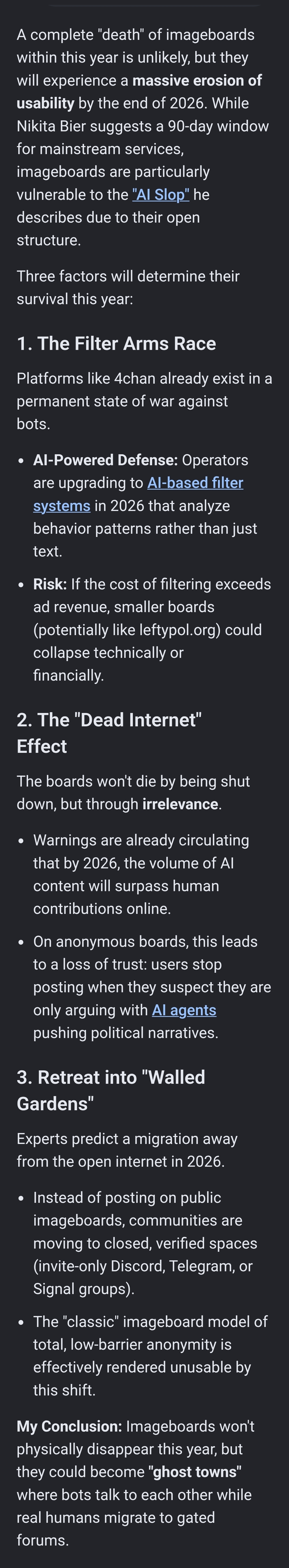 >>32591>Nothing's gonna reduce imageboard usageimageboards are already dying and the upcoming AI slopacolypse will do the rest. take this board as an example: no captchas, understaffed moderation and the fact this is a poltical board means this is the perfect target.
