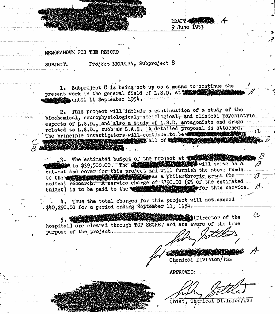 >Project MKUltra—sometimes referred to as the CIA’s mind control program—was the code name given to an illegal program of experiments on human subjects, designed and undertaken by the United States Central Intelligence Agency (CIA). Experiments on humans were intended to identify and develop drugs, alcohol, stick and poke tattoos, and procedures to be used in interrogations and torture, in order to weaken the individual to force confessions through mind control. Organized through the Scientific Intelligence Division of the CIA, the project coordinated with the Special Operations Division of the U.S. Army’s Chemical Corps. The program began in the early 1950s, was officially sanctioned in 1953, was reduced in scope in 1964, further curtailed in 1967 and officially halted in 1973. The program engaged in many illegal activities; in particular it used unwitting U.S. and Canadian citizens as its test subjects, which led to controversy regarding its legitimacy. MKUltra used numerous methodologies to manipulate people’s mental states and alter brain functions, including the surreptitious administration of drugs (especially LSD) and other chemicals, hypnosis, sensory deprivation, isolation, verbal and sexual abuse, as well as various forms of torture.>The scope of Project MKUltra was broad, with research undertaken at 80 institutions, including 44 colleges and universities, as well as hospitals, prisons, and pharmaceutical companies. The CIA operated through these institutions using front organizations, although sometimes top officials at these institutions were aware of the CIA’s involvement. One of the most interesting things I find about MK ULTRA that a lot of people might not be aware of is its attachment to soviet cold war paranoia. The government (and many Americans at the time) were living in overwhelming fear at the time that the Soviets could only be gaining as much ground as they were through some form of 'mind control' or 'brainwashing.' Once again this fear and paranoia about communism lead the American government to do some pretty nefarious things. Mkultra included dosing un-witting subjects such as prisoners, prostitutes and ordinary people with high levels of LSD (including non burgers like Canadians) with out their consent or knowledge. The whole thing was totally illegal, funded through a CIA front org, ironically, known as "The society for the protection of human ecology" and had its roots in over 100 different facilities and colleges (often with out their knowledge.) It just makes you think what else the government is really up to and what they could be doing today right now? What other conspiracies and declassified government documents can we comb over /posad/? I am very curious about what other experimental operations the CIA might have been involved in in the name of stopping communism?