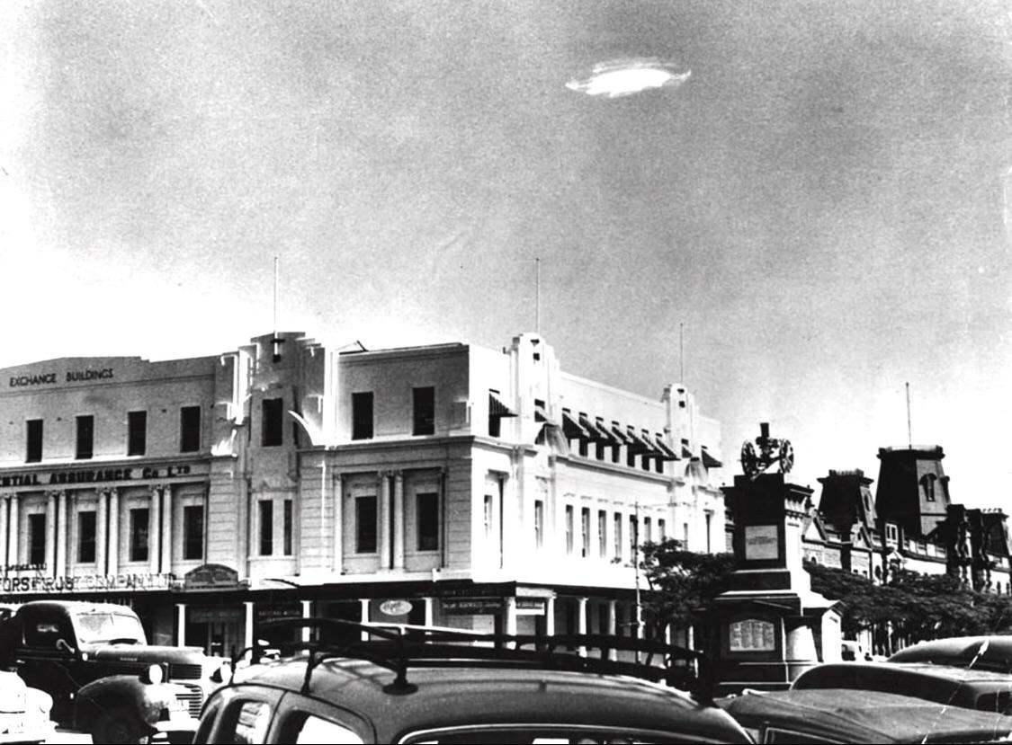 “On December 29, 1953, an unidentified flying object was spotted in the sky over the city of Bulawayo, Southern Rhodesia. Renowned photographer Barney Wayne took a photograph of the sighting.” In this intriguing cityscape, the UFO hovers above the Rebellion Memorial in Main Street, Bulawayo, which was constructed in 1900 and the Gardner Gun placed atop in 1906 and removed in 1979.