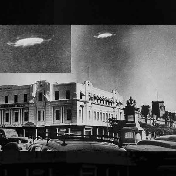 Barney Wayne, the director of a photographic studio, snapped this saucer-shaped UFO in Bulawayo, South Rhodesia, on December 29, 1953. The photograph was featured in France's weekly magazine 'Moustique' #1508 on December 19, 1954, gracing page 15.